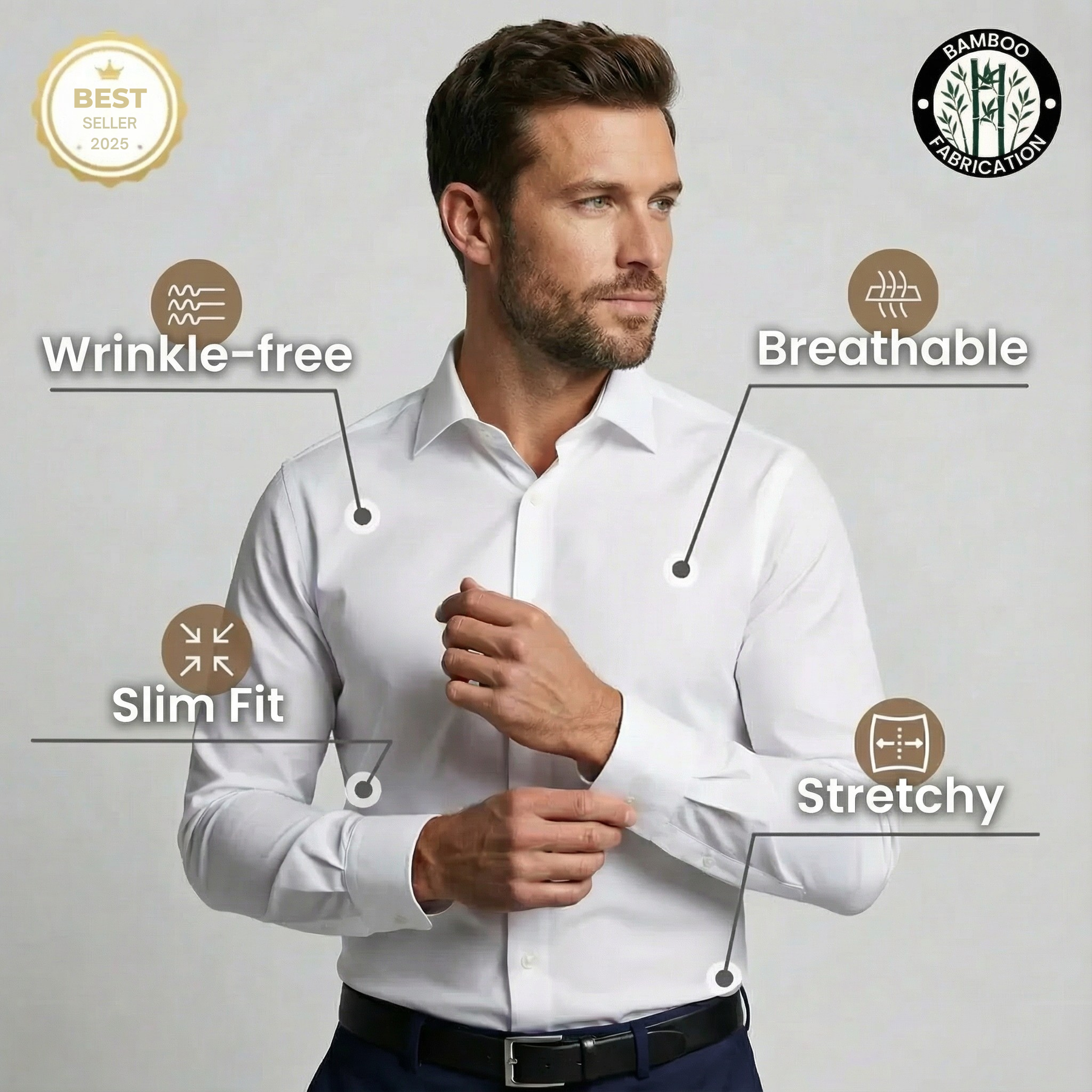 The bamboo-blend feel is soft and breathable, while the stretch keeps the shirt moving with you— so you stay comfortable without sacrificing a sharp, tailored look.